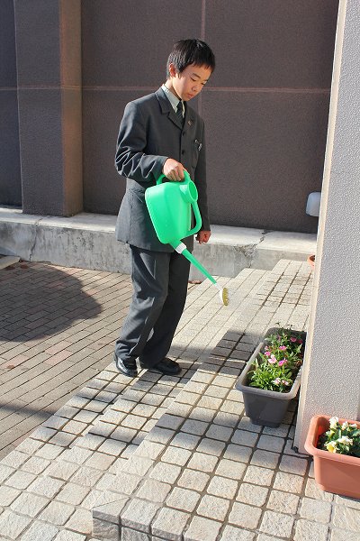 今日は、美化委員会の活動の様子をご紹介します。美化委員会では、朝と昼に花の水やりを行い、校内の美化に努めています。また、学校生活を快適なものにするために、環境美化にも力を入れ、委員会の時間には、校内のゴミ拾いや草刈りなども行っています。