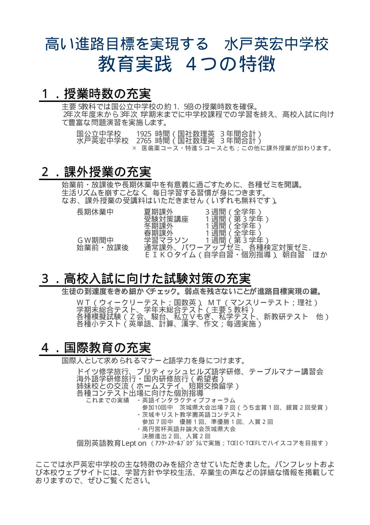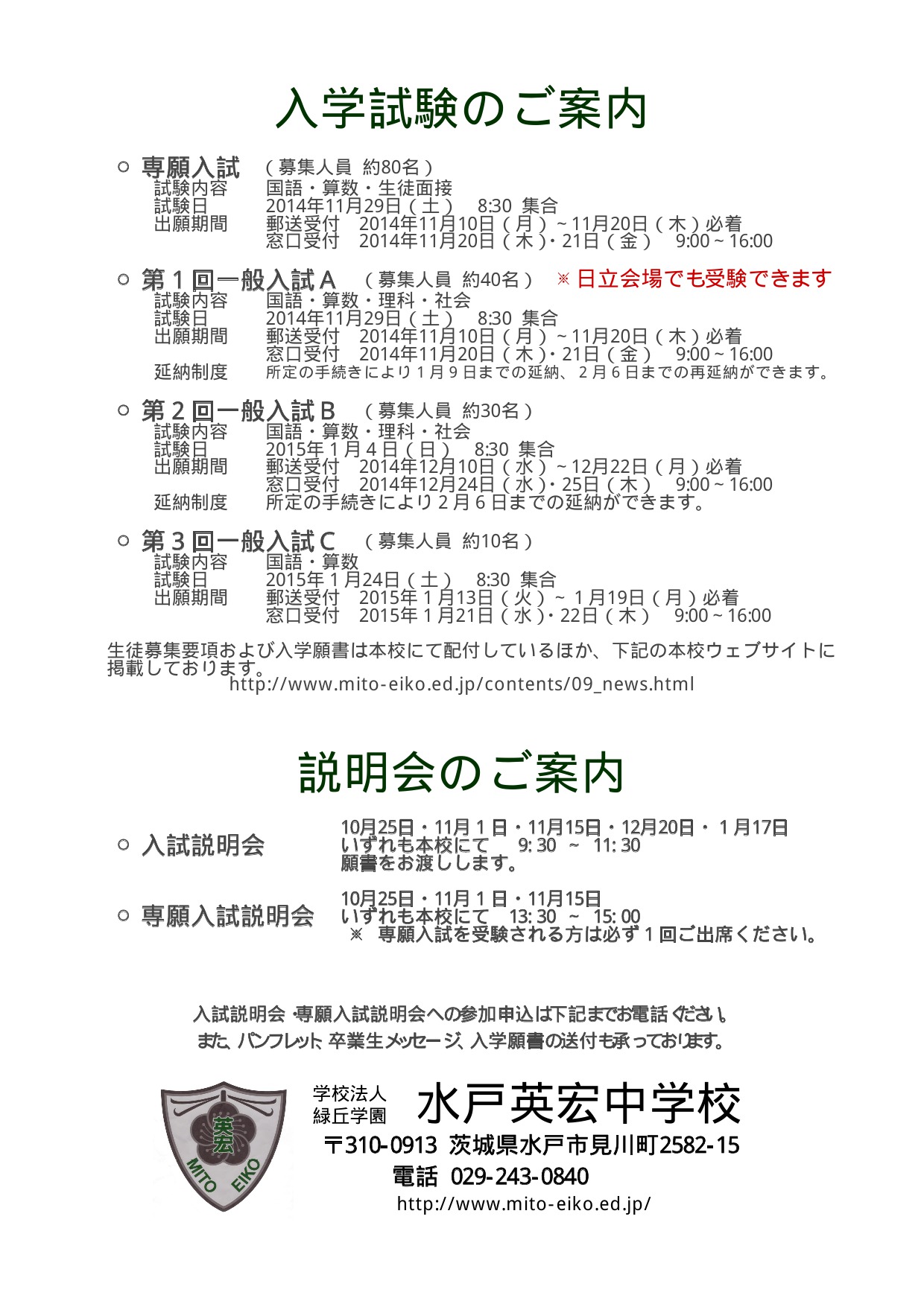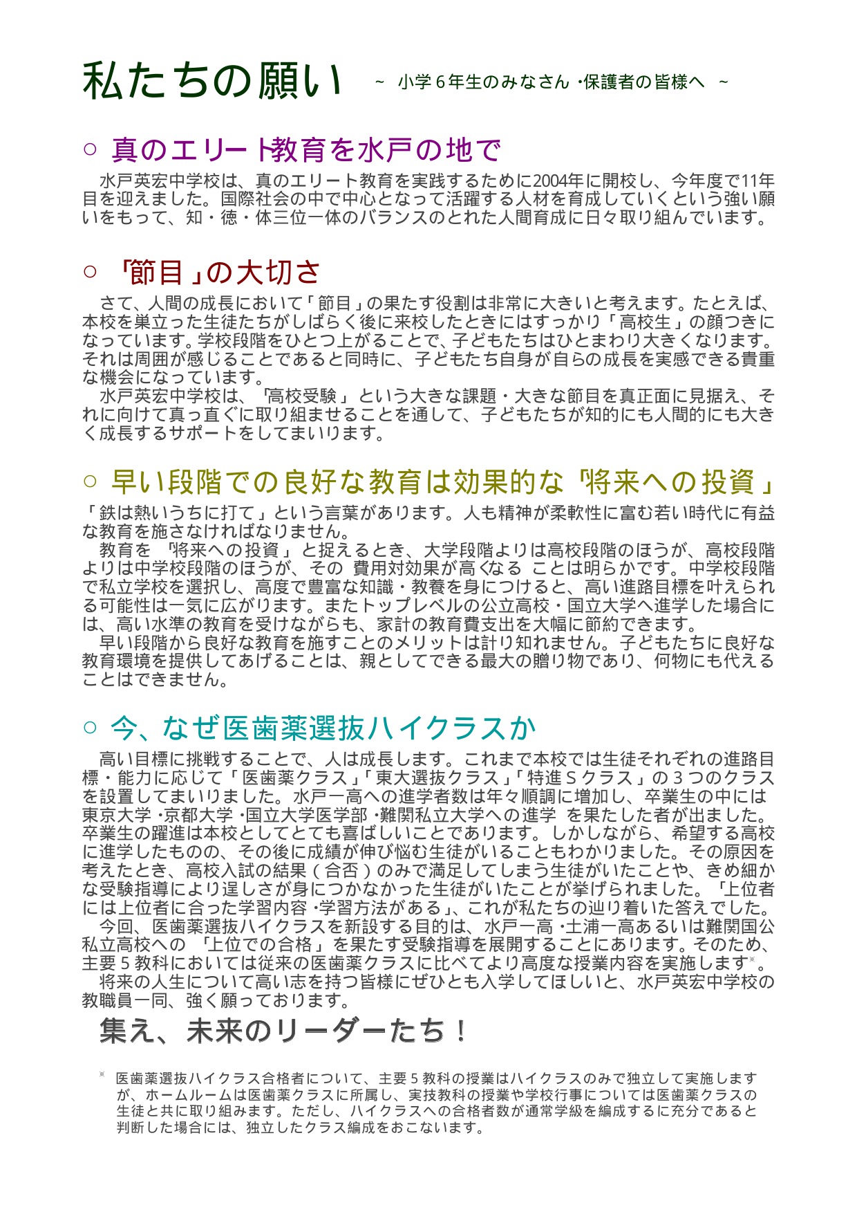 本校ウェブサイトのトップページにも掲載している通り、2015年度新入生から「医歯薬選抜ハイクラス」が新設されます。医歯薬選抜ハイクラス合格者は主要5教科の授業をハイクラスのみで独立して実施し、従来の医歯薬クラスに比べてより高度な授業が展開されます。詳細は下記のチラシをご覧ください。