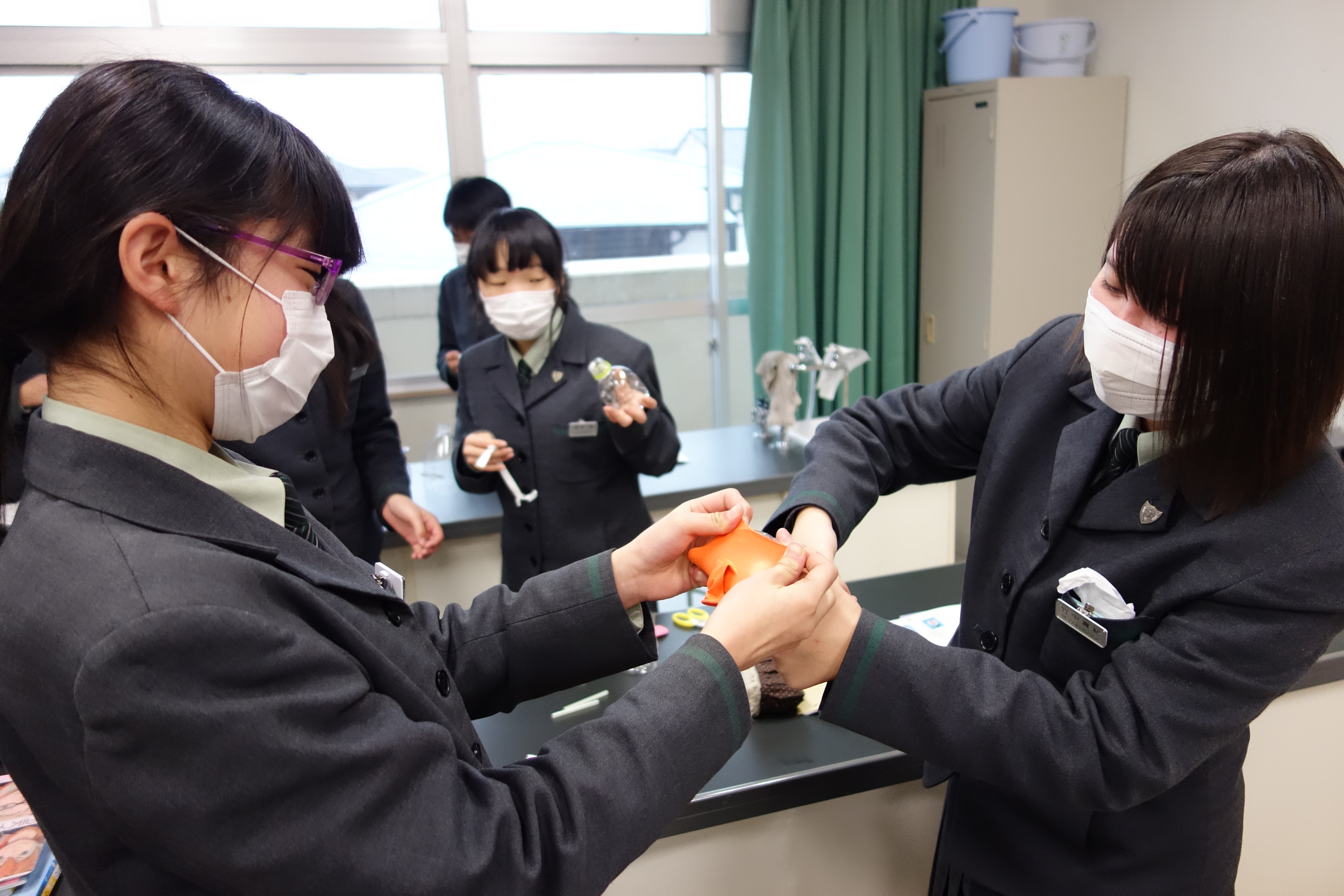 今日の授業は、「肺のしくみ」についての実験でした。先生の説明をしっかりと聞いた後、肺がどのようなしくみで動いているのか理解するためにどの生徒も意欲的に実験に取り組んでいました。今日の学習の成果を今後の試験等で十分に発揮して欲しいと思います。