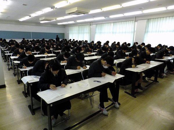 生徒それぞれ緊張した面持ちで諸注意を聞き、5教科の試験に臨んでいました。