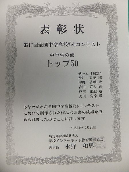 第17回全国中学高校Webコンテストで2年3組滑川さん・大川さん、1年1組中庭さん・吉田さん、1年3組戸田さんのチームが中学生の部においてトップ50入りを果たしました!