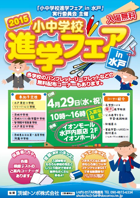4月29日(水・祝)、『小中学校進学フェア in 水戸』がイオンモール水戸内原店2Fイオンホールにて開催されます。本校も参加します!学校生活や入試のことなど、些細なことでも構いません。皆さんの質問に教職員が個別でお答えします。詳細は、上記画像をご覧ください。