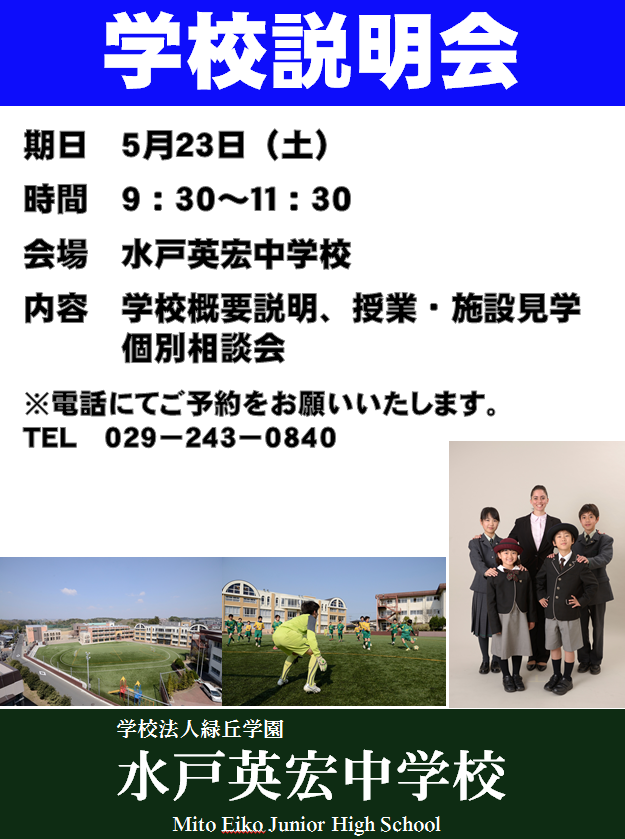 学校説明会開催!期日 5月23日(土)時間 9:30~11:30会場 水戸英宏中学校内容 学校概要説明、施設・授業見学 個別相談会実施※ご予約はお電話にてお願いいたします。TEL029-243-0840