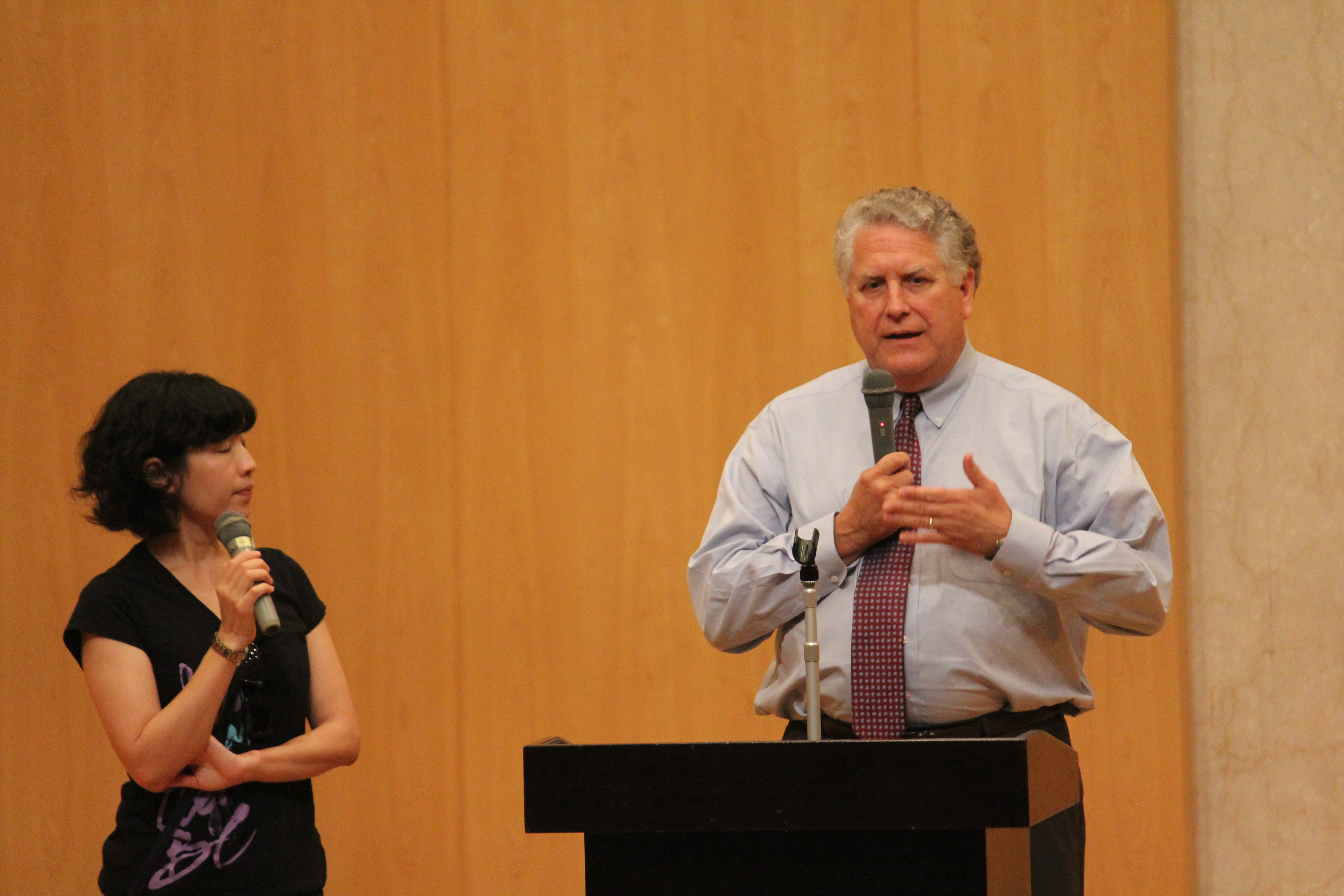 今日は、先週より留学で水戸英宏小・中学校を訪問しているBright Schoolの校長先生が、アメリカの文化や歴史、学校における学習状況などについての講演をしてくださいました。