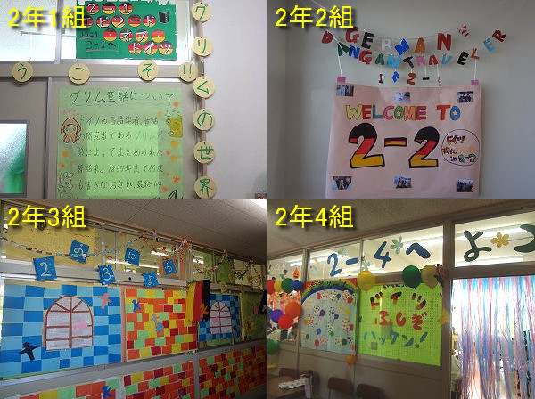 1学年は「日本文化」について、2学年は「ドイツ」について、3学年は「自然科学」について、クラス毎に工夫された展示がなされていました。明日も引き続き、良い文化祭になるよう、みんなで協力して頑張っていって欲しいと思います。各クラスの学級研究テーマは以下の通りです。1年1組   「日本一周旅行」1年2組   「源氏資料館」1年3組   「グサッとシュシュッとやりますがなにか!?」1年4組   「ゲゲゲの四組」2年1組   「2年1組 エピソード オブ ドイツ」2年2組   「ドイツ 弾丸トラベラー in 2-2」2年3組   「2の3の2の3による2の3のためのサッカー」2年4組   「ドイツふしぎ発見!!」3年1組   「三ノ一少年の実験簿」3年2組   「S・S・S 3☆2」3年3組   「コバちゃんのwild science」3年4組   「自然の館 ~西かわールド~」2日目の主な予定です。・音楽部・文芸部の発表・スピーチコンテスト・海外語学研修発表・ステージ自由発表・合唱コンクール  (12時00分~)・演劇同好会 「とびらのむこう」 (14時30分~)