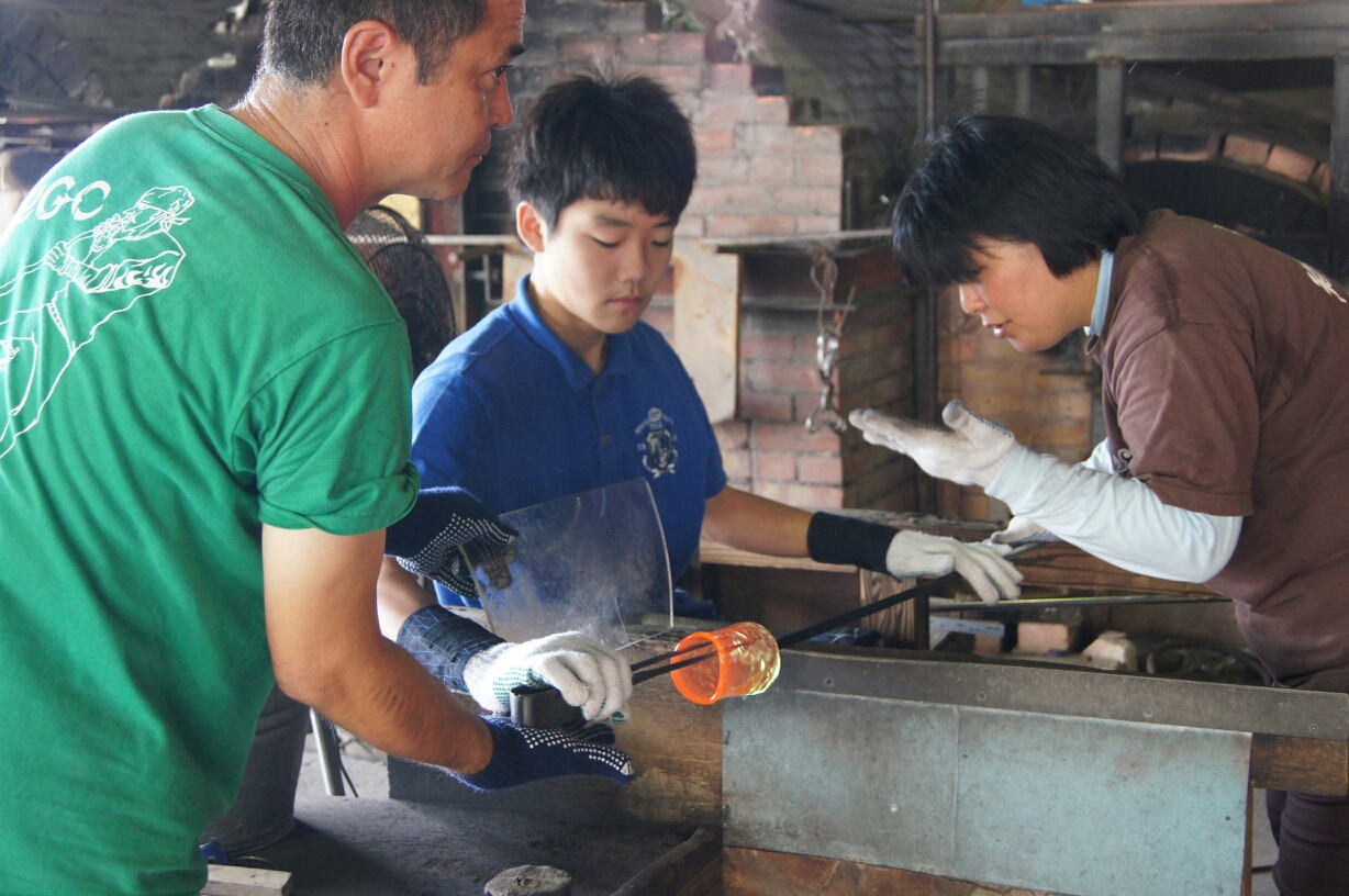 1ヵ所目は、森のガラス館です。ここでは吹きガラス作りの体験をしてきました。「最初は弱く、段々と強く吹いてください」とのアドバイス通りに行いました。ここで作ったコップは、約1週間で本校に送られてきますので、完成がとても楽しみです。