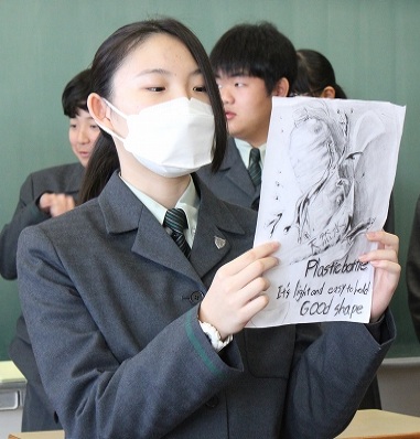 英宏中の生徒は身の回りにある様々なユニバーサルデザインについて、英語で紹介しました。